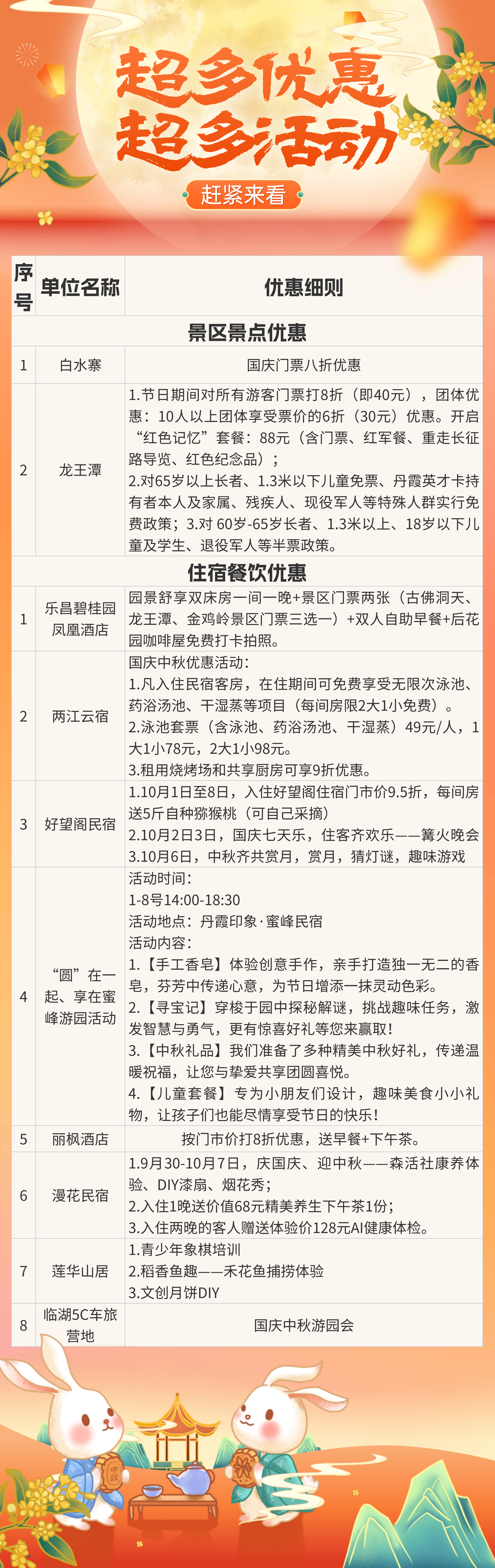 之前暑期推出,呼声超高的 “吃住在乐昌,免费游景区”活动,好多消费者直呼“没赶上”“没玩够”。别急,双节黄金周乐昌直接重启福利。乐昌多家民宿、酒店联合热门景区送上“中秋加国庆”双节假期惊喜,入住参与活动的酒店或民宿,即可免费领取合作景区门票,开启免费畅游之旅。
